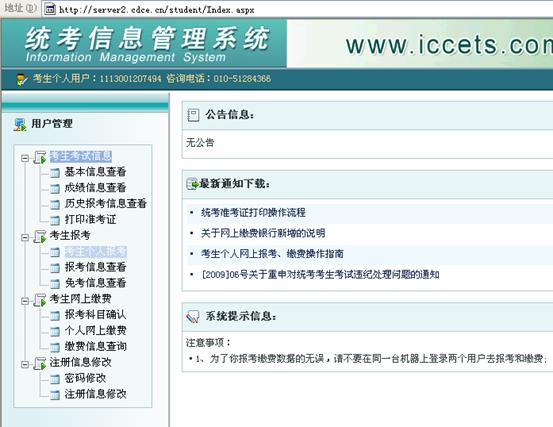 2、弹出学生个人报考页面,涉及项目在左侧列示