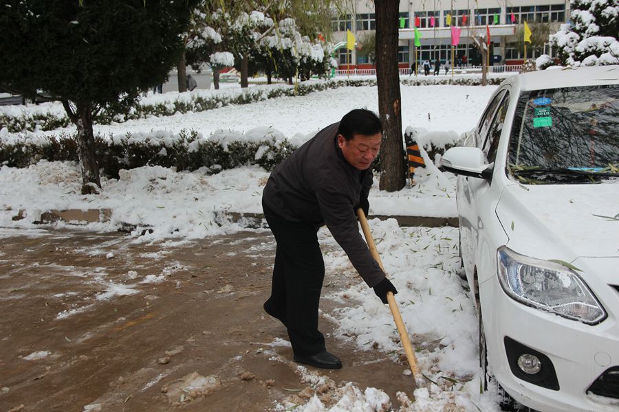 2016年立冬以来第一场雪带着冬的信息飘然而至,使大地万物银装素裹,世界犹如童话般,但道路上厚厚的积雪给教职工的出行带来了不便。为畅通交通,方便大家出行,11月21日学校组织全体教职工在第一时间开展了扫雪活动。