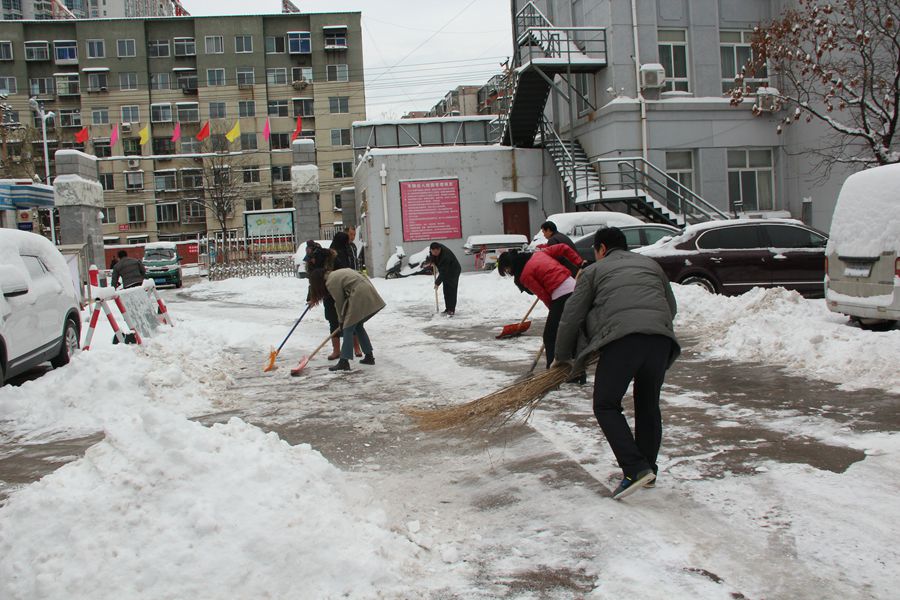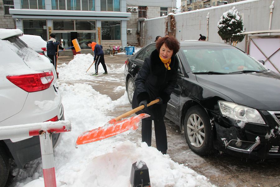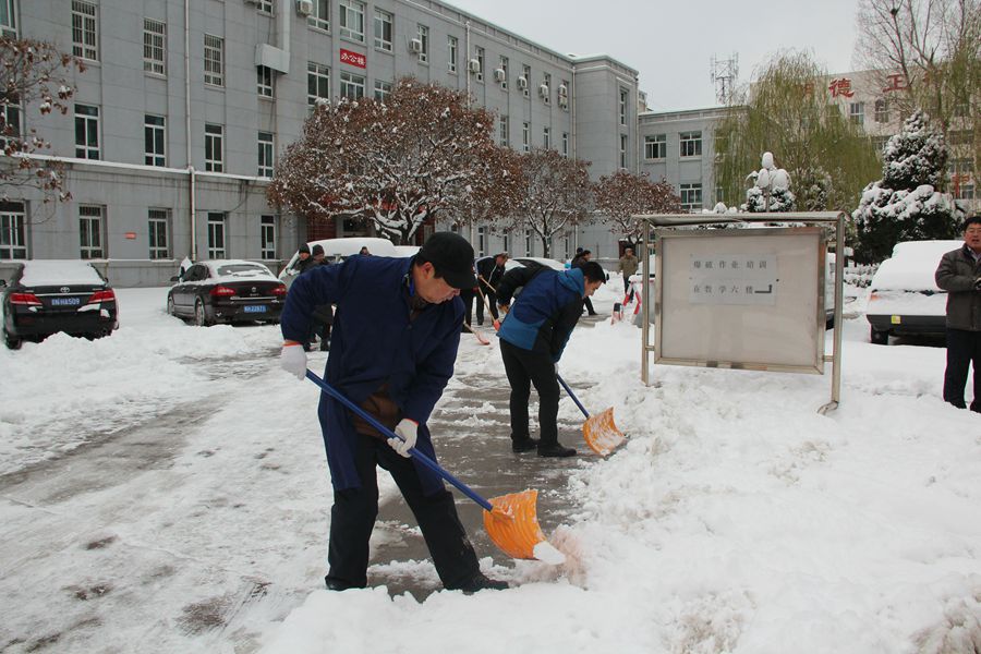 21日清晨,我校姚钢乾书记、杨永明书记带领夜间值班人员王志泉、王超、韩永春、刘显达及部分学生冒着寒风,拿起铁锹、扫帚等工具,组建扫雪队伍,率先将校园路面上厚厚的积雪推到两侧,为上班的同事清除路障。随后,学校组织全体教职工清扫校园积雪,大家不畏严寒,积极主动、相互配合、齐心协力,挥舞着铁锹和笤帚,你铲我扫,逐步将积雪和冰层铲起集中堆放,尽管大家的脸都冻得通红,但心中很温暖,在欢声笑语中清扫出干净的校园和畅通的大道。经过一个多小时的辛勤劳动,校园内、外道路上均清扫干净,使大家在安全行走的同时增添了几分好心情。(办公室 高琳)