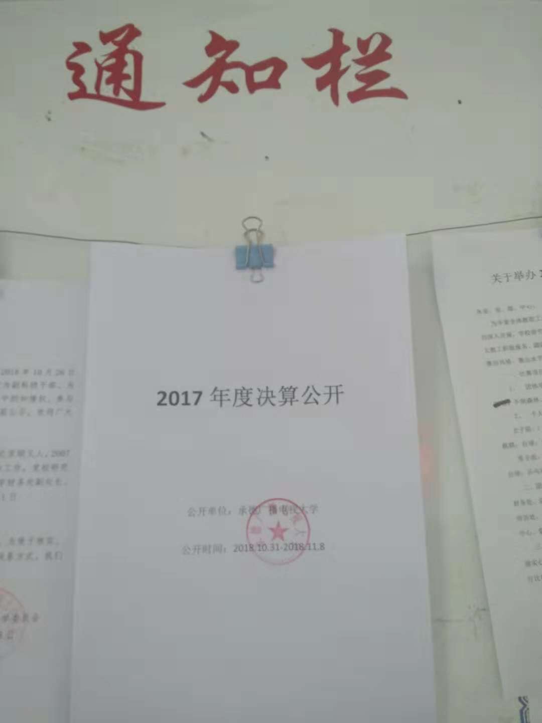 承德广播电视大学2017年决算已在办公楼一楼公示栏进行公开,公示期为2018年10月31日——2018年11月8日。