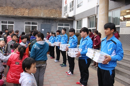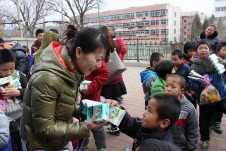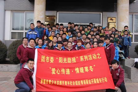 寒冬将至,团市委“阳光助残”系列活动之“爱心传递 情暖寒冬”的暖冬行动正式起航。2014年11月27日下午,我校10名青年志愿者参与了由共青团承德市委、承德市青少年宫携手承德市青年社会组织青春驿站到承德市特殊教育学校开展的“关爱残疾儿童 传递人间大爱”为主题的“阳光助残”暖冬行动。活动期间,我校师生与同学们进行了交流互动,表演了精心准备的手语《隐形的翅膀》,并为孩子们送上了智力拼图、转笔刀、酸奶、饼干等价值1500元的慰问品。