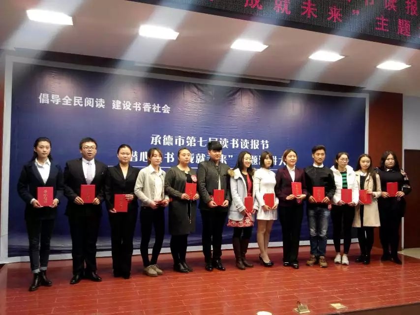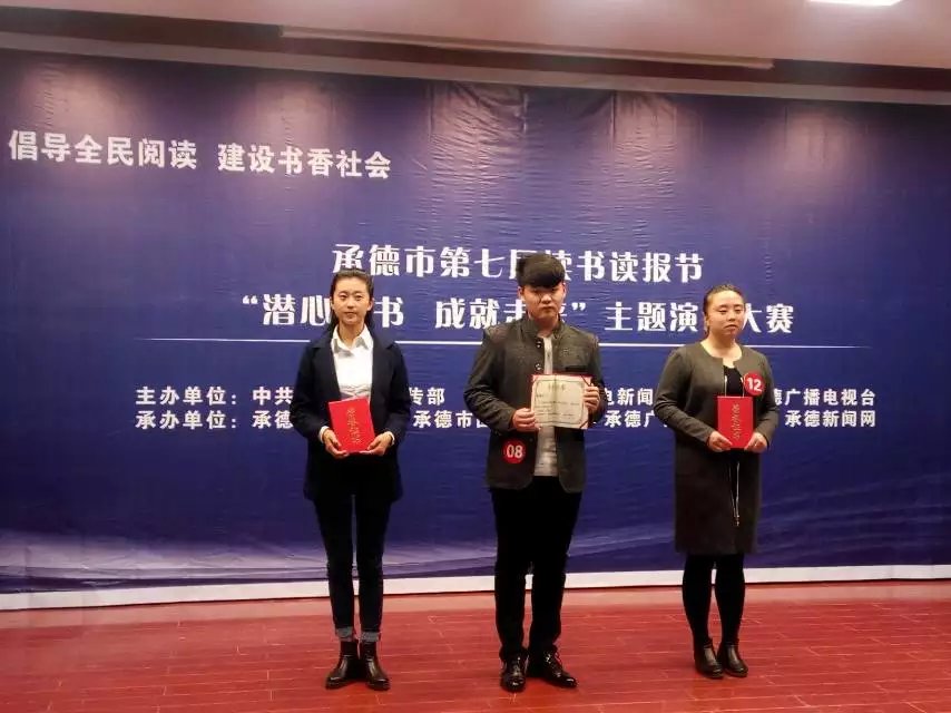 2015年10月20日下午,由中共承德市委宣传部、承德市文广新局、承德市电视台主办、承德市图书馆、承德市图书馆学会、承德广播电视报社、承德新闻网承办的承德市第七届读书读报节“潜心读书、成就未来”主题演讲大赛在河北民族师范学院如期举行。经过紧张激烈的对决,我校2014秋季电子商务班栾孟杰及2014春季计算机一班王海淑两位同学分别荣获了“三等奖”及“优秀奖”的好成绩。